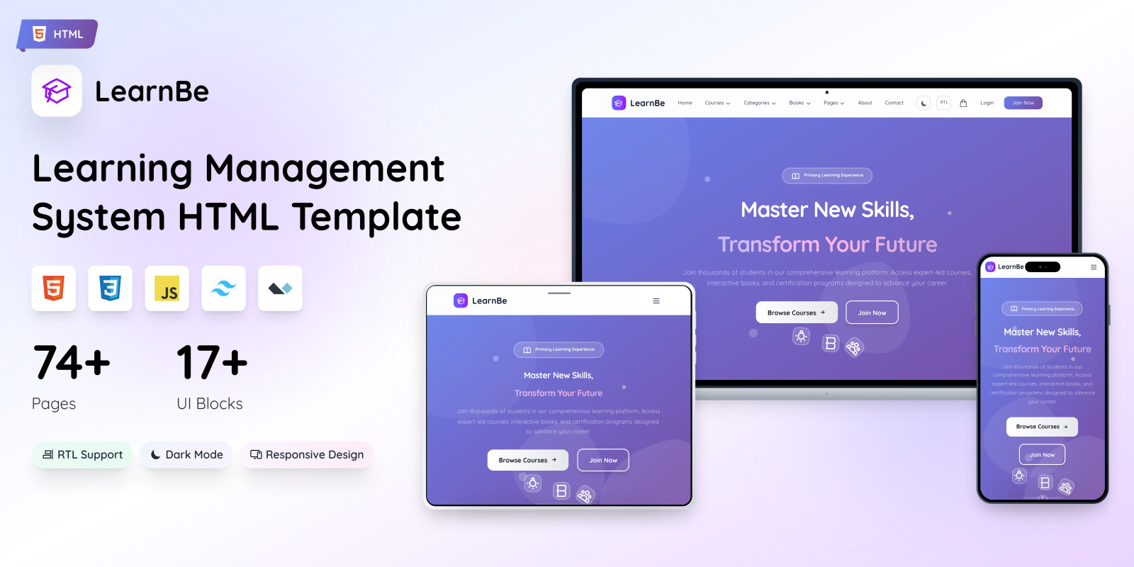 LearnBe is a comprehensive, modern Learning Management System (LMS) template designed for educational institutions, online course platforms, and e-learning businesses. Built with HTML, CSS, and JavaScript, this template provides everything you need to create a professional online learning platform.
